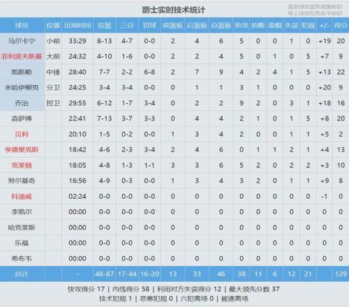 伦纳德首发出战29分钟,投篮9中3,三分5中1,罚球3中3,得到10分4篮板2助攻1抢断1盖帽,正负值-25全场最低。哈登同样首发出战29分钟,投篮12中5,三分9中2,罚球4中3,得到15分3篮板11助攻,正负值-21全场第二低。