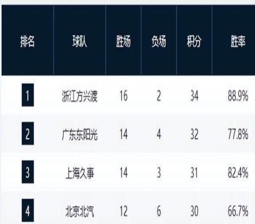广厦作为卫冕冠军,实力强劲,目前以16胜2负的战绩领跑积分榜,胜率达到惊人的88.9%,是CBA20支球队中唯一一支胜率超过85%的球队。广东队以14胜4负的战绩紧随其后,上海队则因少赛一轮,以14胜3负的战绩暂居第三。