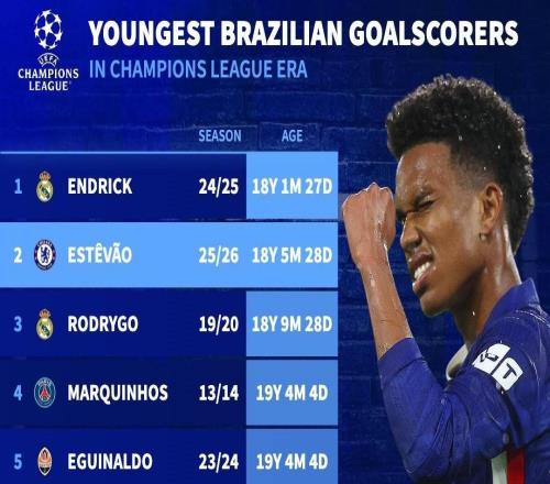 在与阿贾克斯的比赛中斩获欧冠生涯处子球后,18岁的埃斯特旺成为切尔西队史欧冠最年轻进球者,他也是欧冠进球第二年轻的巴西球员,仅次于恩德里克。欧冠进球最年轻的巴西球员1.